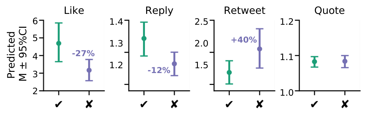 \(\downarrow\) but fewer likes & replies